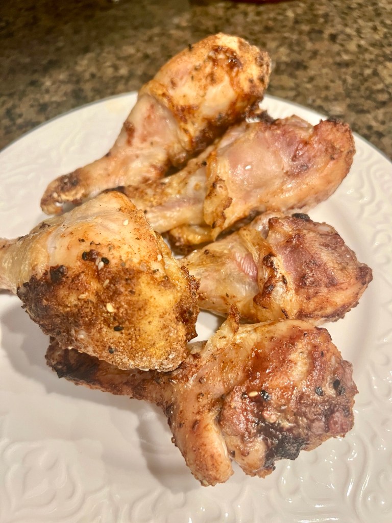 mix seasonings in a bowl. Coat each h drumstick in seasoning mix. Once all drumsticks are coated, drizzle olive oil on top. Place in air fryer. I cooked 4 at a time. You want to make sure they have enough space. Cook at 400 for 18 minutes. Flip drumsticks at 9 minutes. Enjoy!
