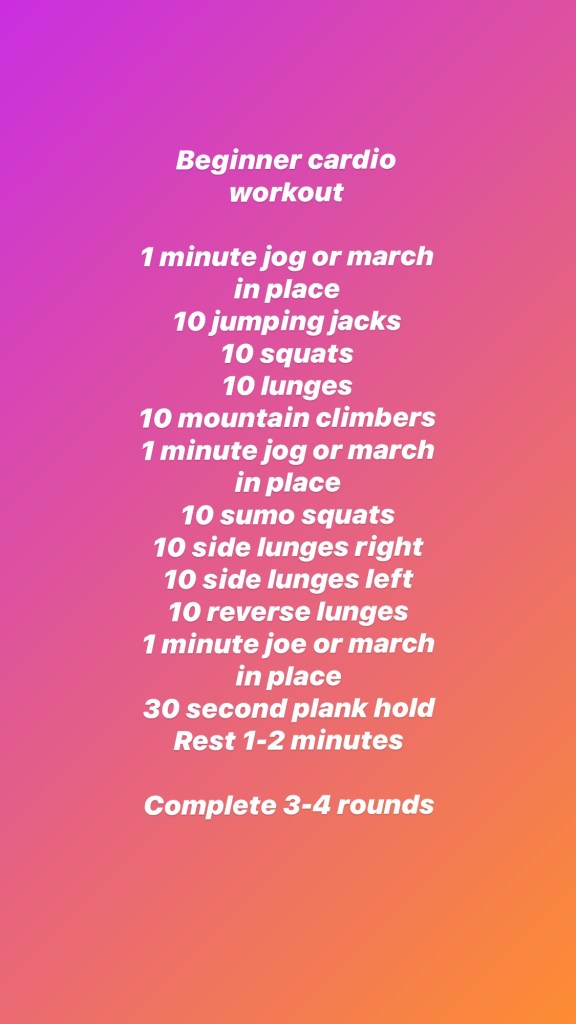 Here is a cardio workout you can do at home to get you started. Remember that you can always modify or change an exercise if it doesn’t work for you.
