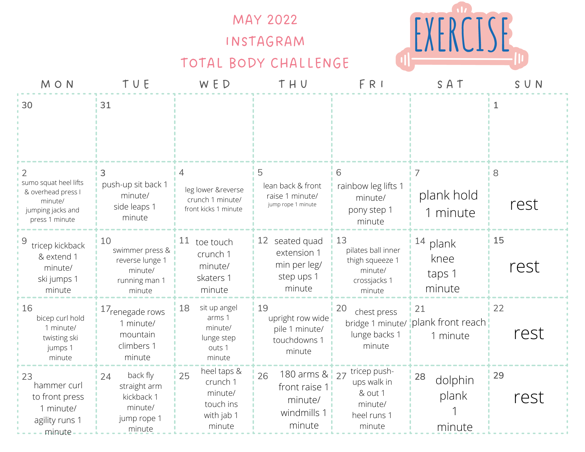 May is almost here, and it is time for another challenge! For the month of May, we will have one strength exercise and one cardio drill each day. If you are new to these challenges, just do your best. Rest when you need to but challenge yourself. Download the calendar if you want to know what to expect each day.