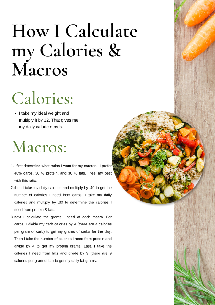 This is the way I determine my calorie and macro goals for the day. Sometimes I make adjustments based on goals or weight changes, but the formula stays the same. I hope this helps you determine your goals!