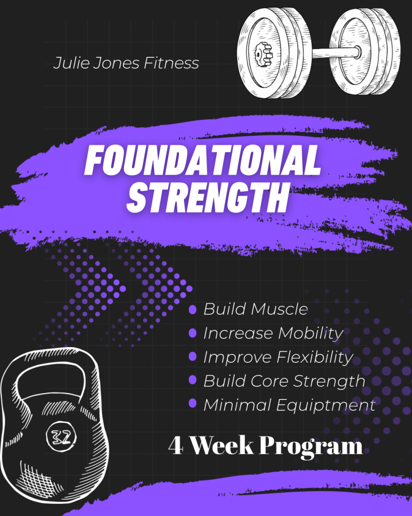 Join me for this 12 week strength program with balance work, mobility, functional movement, stretching and core work. You will also get a bonus nutrition guide!