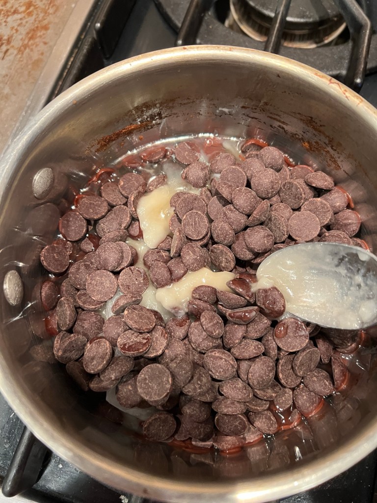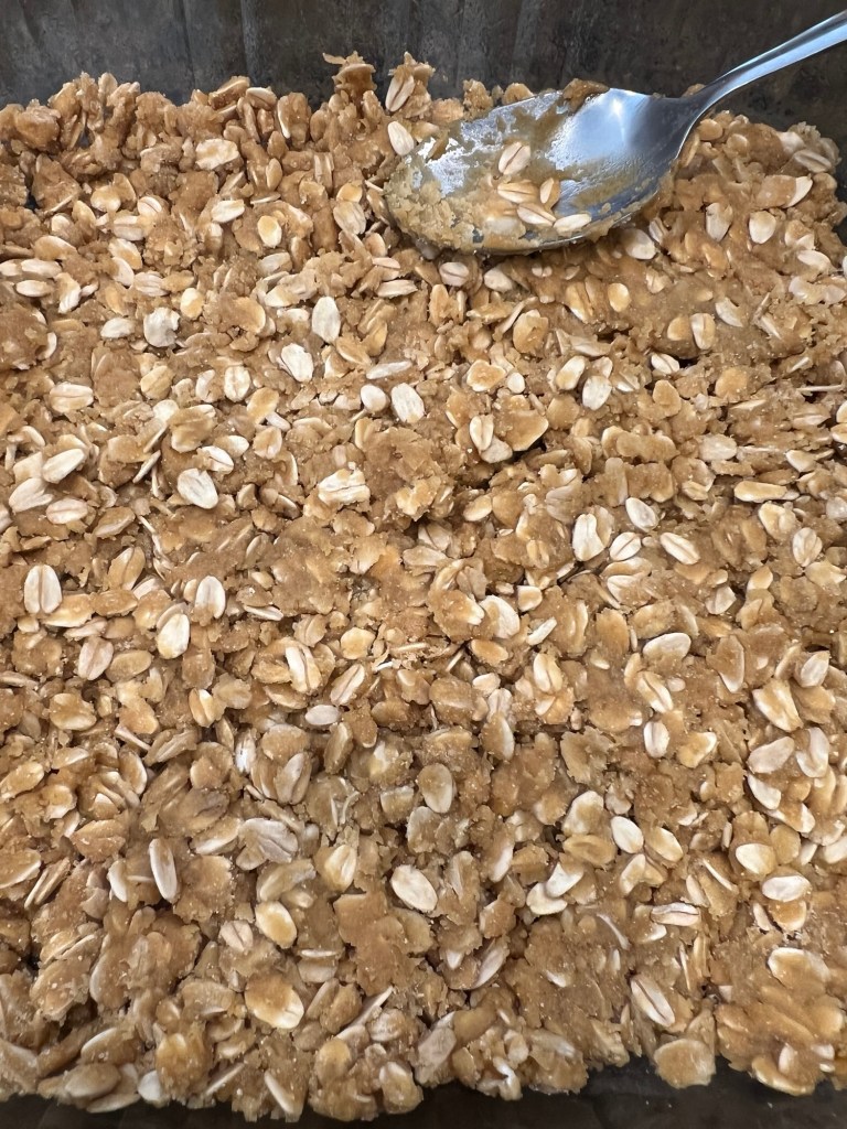 Add 1/2 of the dry mixture to the bottom of an 8X8 baking pan and press down gently.