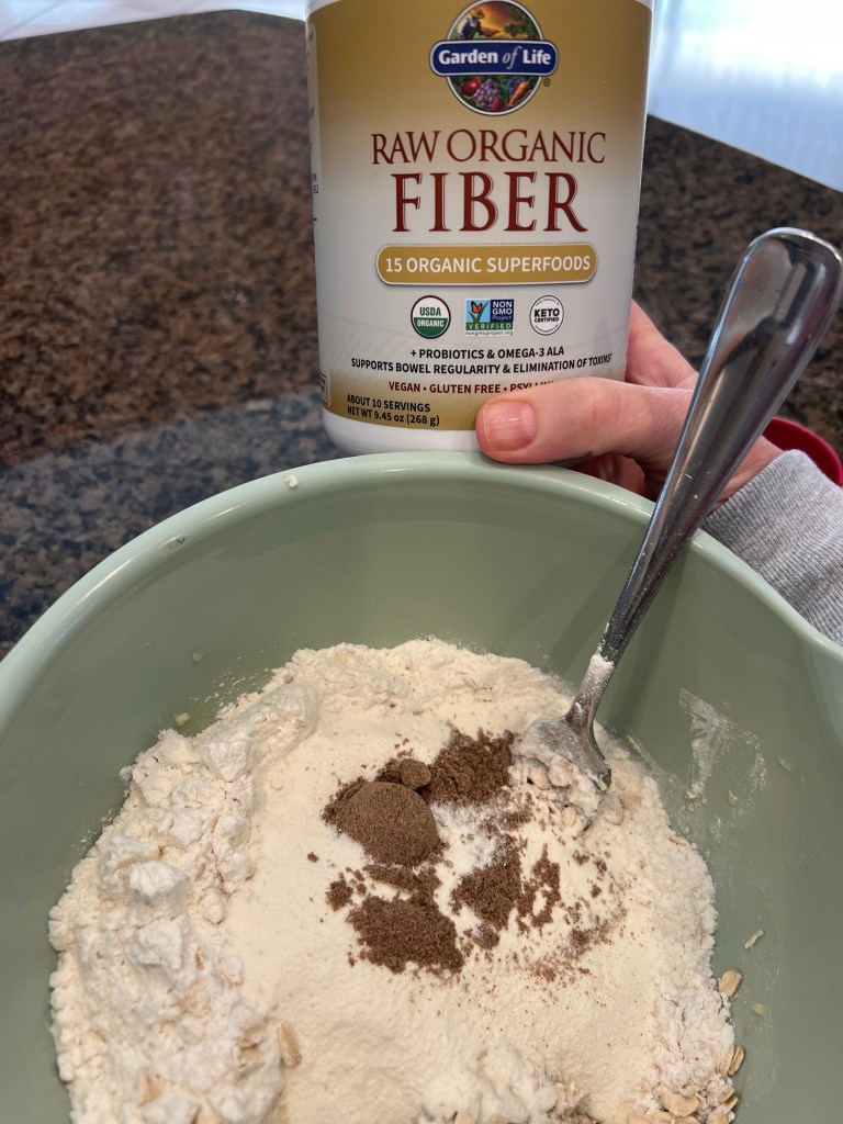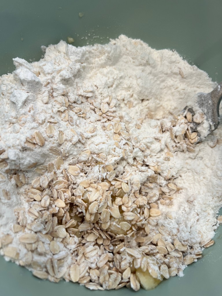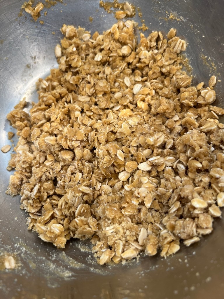 Start by mixing 1 1/2 cups flour with 1 1/4 cups rolled oats together. Add in 1/4 tsp salt, 1/2 tsp vanilla and 1/3 cup avocado oil. Mix well. Then add 1/2 cup pure maple syrup. You will use this mixture for the crust and topping.